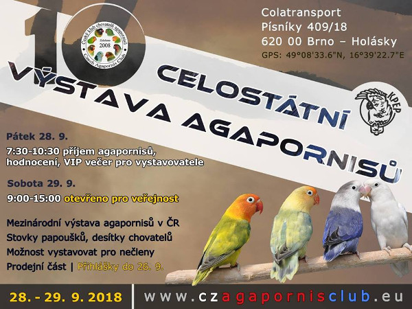 Český klub chovatelů agapornisů pořádá ve dnech 28. – 29. 9. 2018 jubilejní 10. Celostátní výstavu agapornisů. V pátek 28. 9. proběhne příjem agapornisů, jejich bodování a vyhodnocení, večer pak posezení vystavovatelů a členů klubu při příležitosti 10. výstavy a 10 let od založení klubu. Druhý den, tj. v sobotu 29. 9. bude výstava od 9:00 do 15:00 otevřena pro veřejnost, vstupné je dobrovolné.