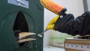 Maňásek navlečený na ruce se k mláďatům dostává provizorním vletovým otvorem, kterým přímo do zobáčků vpravuje kousky myší, čerstvé fíky nebo hroznové víno. Zoborožec nosorožčí pochází z jižního Thajska, Malajsie, Indonésie a Bruneje. V minulosti se vyskytoval i v Singapuru, kde však místní populace již vyhynula. Červená kniha ohrožených živočichů IUCN jej vede v kategorii zranitelných druhů. Podle mezinárodní organizace BirdLife International je pravděpodobné, že během tří následujících generací klesne početnost jeho divoké populace téměř na polovinu dnešního stavu. Největší ohrožení zoborožci nosorožčímu způsobuje masivní odlesňování.