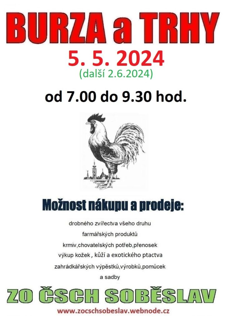 ZO ČSCH Soběslav pořádá tradiční burzu králíků, holubů, drůbeže a exotického ptactva. Prodej krmiv a chovatelských potřeb.
