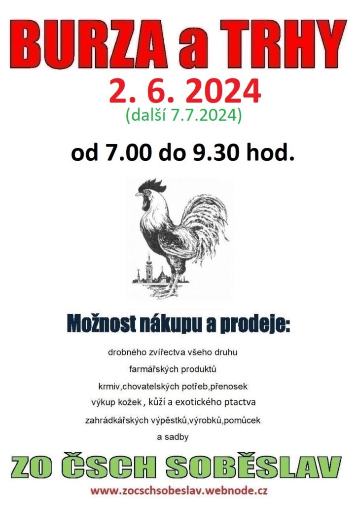 ZO ČSCH Soběslav pořádá tradiční burzu králíků, holubů, drůbeže a exotického ptactva. Prodej krmiv a chovatelských potřeb.