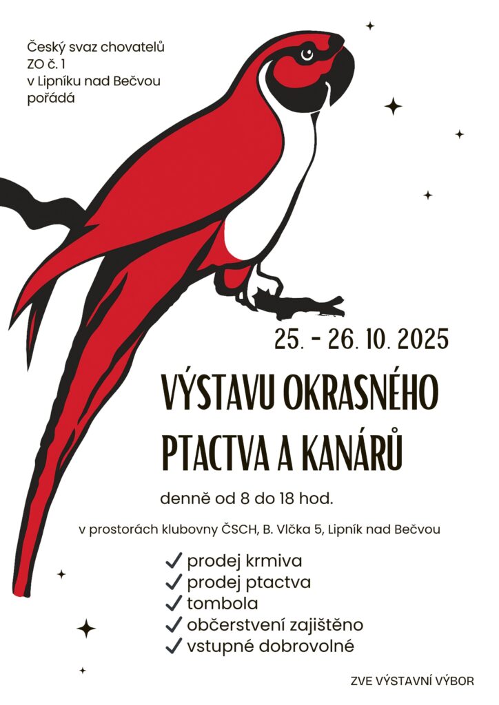 ZO ČSCH Lipník nad Bečvou pořádá výstavu okrasného ptactva a kanárů v prostorách klubovny ČSCH, B. Vlčka 5, Lipník nad Bečvou. Vstupné dobrovolné, občerstvení zajištěno. Na místě bude prodej ptactva a krmiva i tombola.