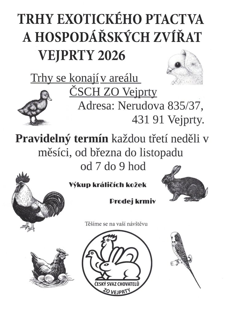 ZO ČSCH Vejprty pořádá každou třetí neděli v měsíci ve svém chovatelské areálu v Nerudově ulici trhy exotického ptactva a drobných hospodářských zvířat. Dále je zde možnost nákupu chovatelských potřeb a akvarijních ryb. Občerstvení zajištěno. Vstupné 50 Kč.