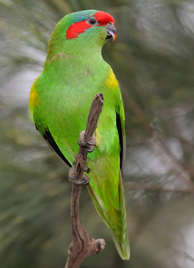 Ve volné přírodě obývá jihovýchodní a východní pobřeží Austrálie a Tasmánii. Je běžný, jeho populace nevykazuje žádné výkyvy. Tasmánští ptáci bývají více zelení, červené znaky na hlavě jsou u nich bledší a chybí bronzové zbarvení zad. Často bývá spatřen ve společných hejnech s latamy vlaštovčími a lorii malými. Vyskytuje se v různých typech krajin podle ročního období. Narazit na něj lze jak na pobřežních dunách, tak v pahorkatinách i vyšších polohách. Sice je zařazen do Červené knihy ohrožených živočichů IUCN, ale do nejnižší kategorie LC – nejméně znepokojivý. Nemá žádné poddruhy.